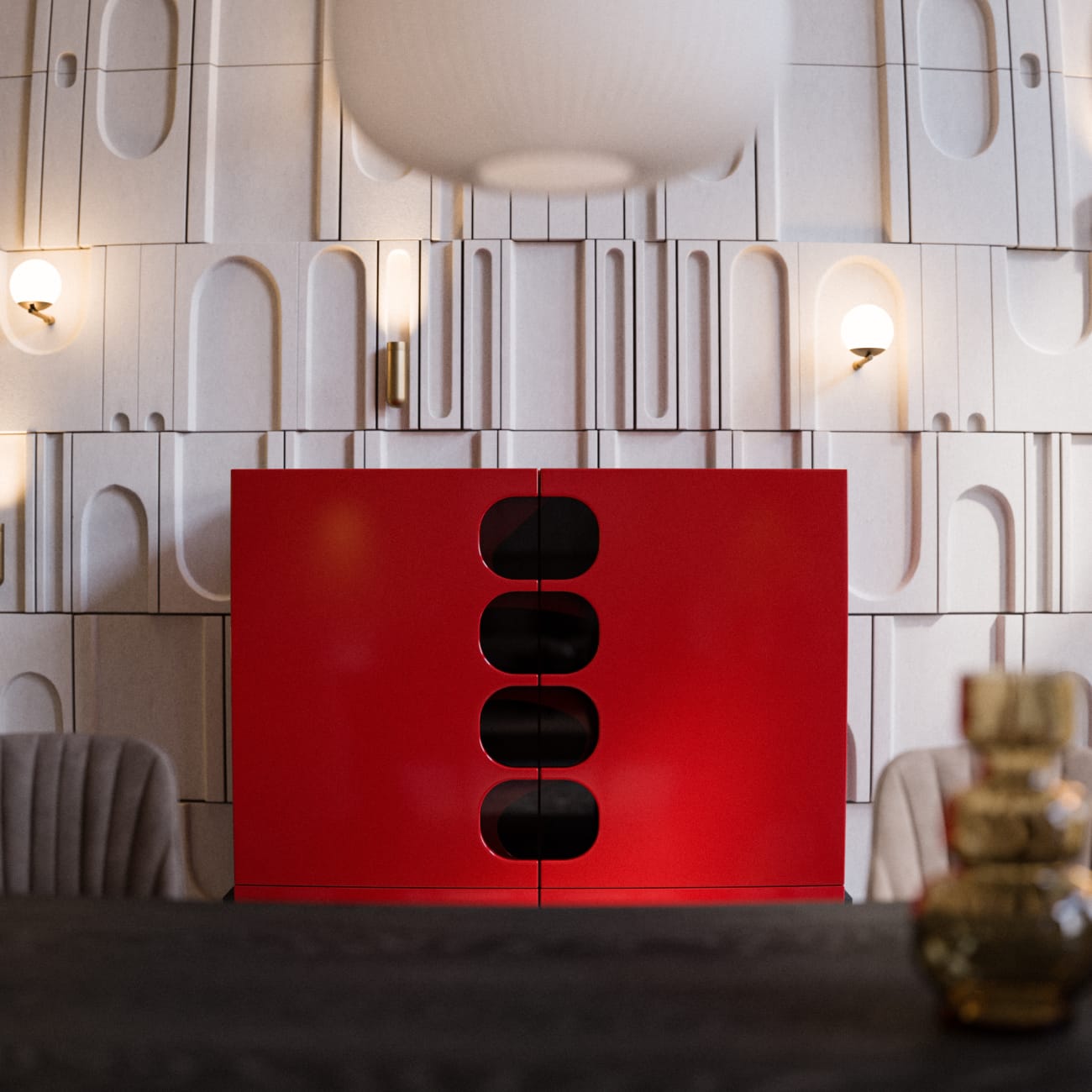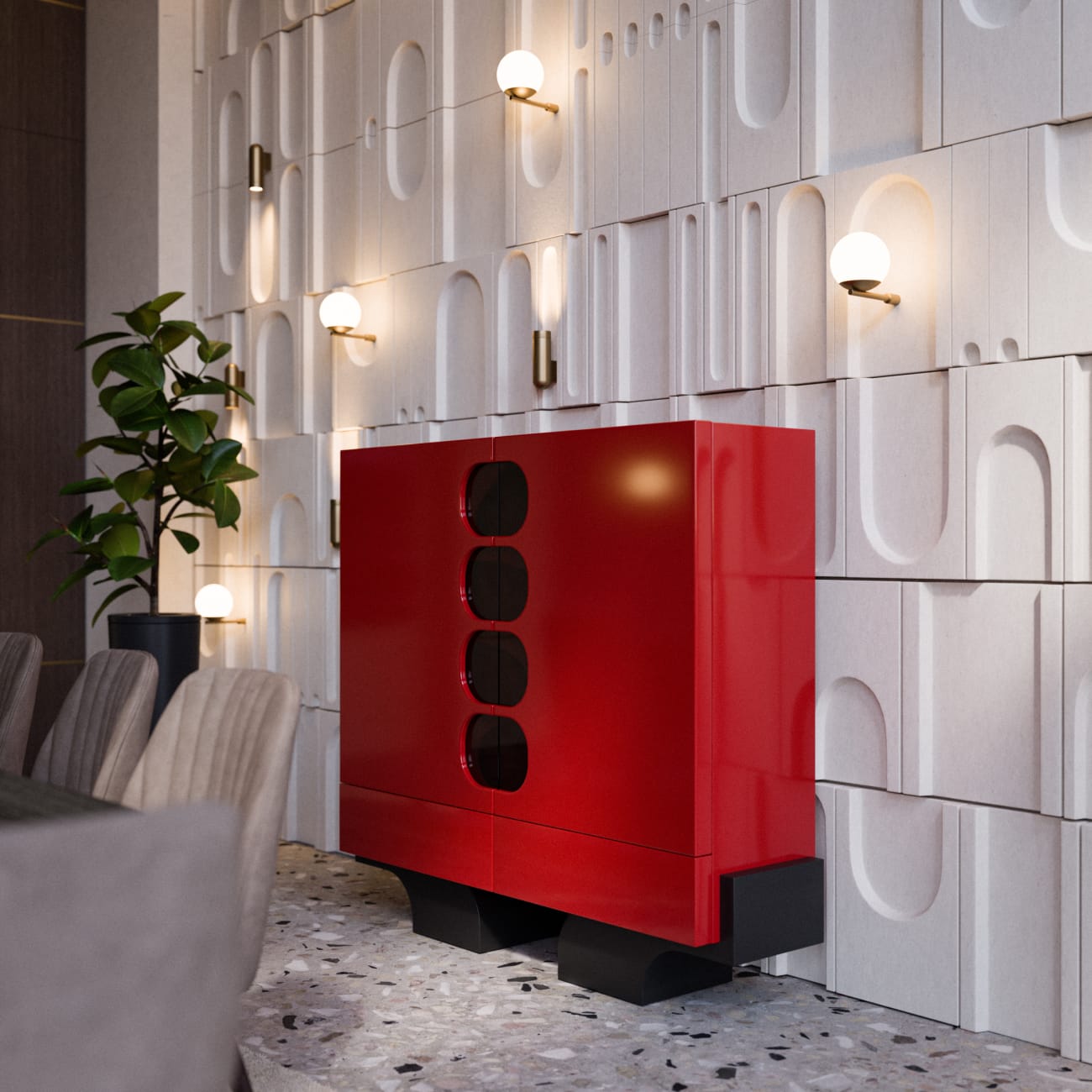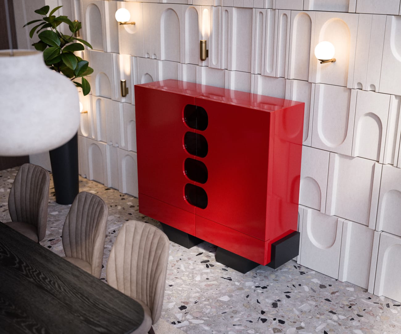 Dali konsol, şık tasarımı ve geniş iç hacmi ile değerli eşyalarınızı sergilemek için ideal bir seçenektir. Modern görünümü ile evinize zarafet katar.